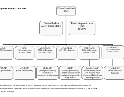 Riferimenti: Diagnosis Flowchart for Myasthenia Gravis – EuroMyasthenia; International Consensus Guidance for MG 2020 (MGFA):...