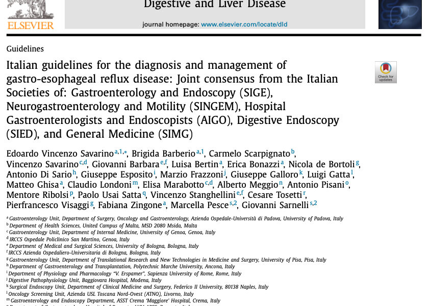 - Italian guidelines for the diagnosis and management of gastro-esophageal reflux disease: Joint consensus from the Italian Societies of Gastroenterology and Endoscopy (SIGE), Neurogastroenterology and Motility (SINGEM), Hospital Gastroenterologists and Endoscopists (AIGO), Digestive Endoscopy (SIED), and General Medicine (SIMG).